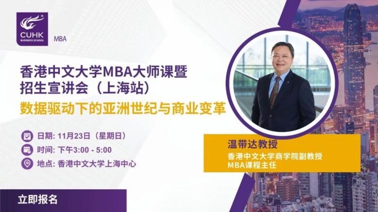 香(xiang)港(gang)中文(wen)大(da)學(xue)MBA課(ke)程(cheng)將于11月(yue)23號(周(zhou)日)在上海(hai)舉辦MBA大師課暨招生宣講會。我們將從數據驅動的角度,探討亞洲世紀所帶來的全新商業格局與其所蘊含的商業機遇與挑戰,助您拓展職業道路。