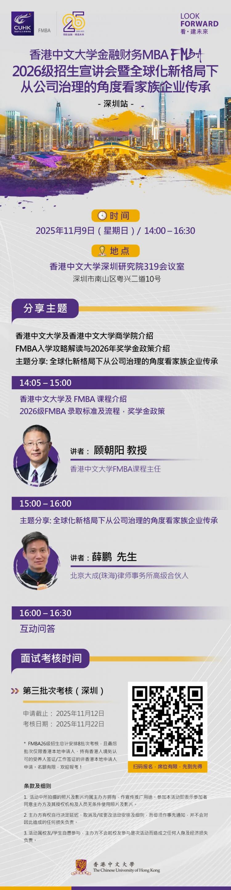 深圳站 | 香港中文大學FMBA2026級招生宣講會暨全球化新格局下從公司治理的角度看家族企業傳承